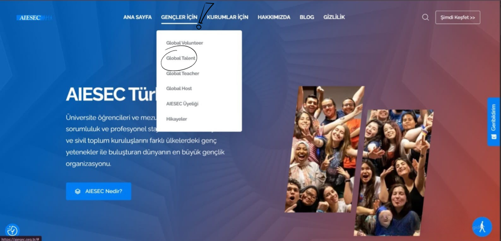 “GENÇLER İÇİN” kısmına tıklayıp Global Talent sayfasına giriş yapabilirsin.