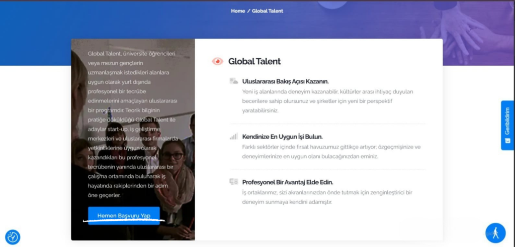 2- Karşına çıkan sayfada Global Talent Projesinin saba kazandıracağı fırsatları